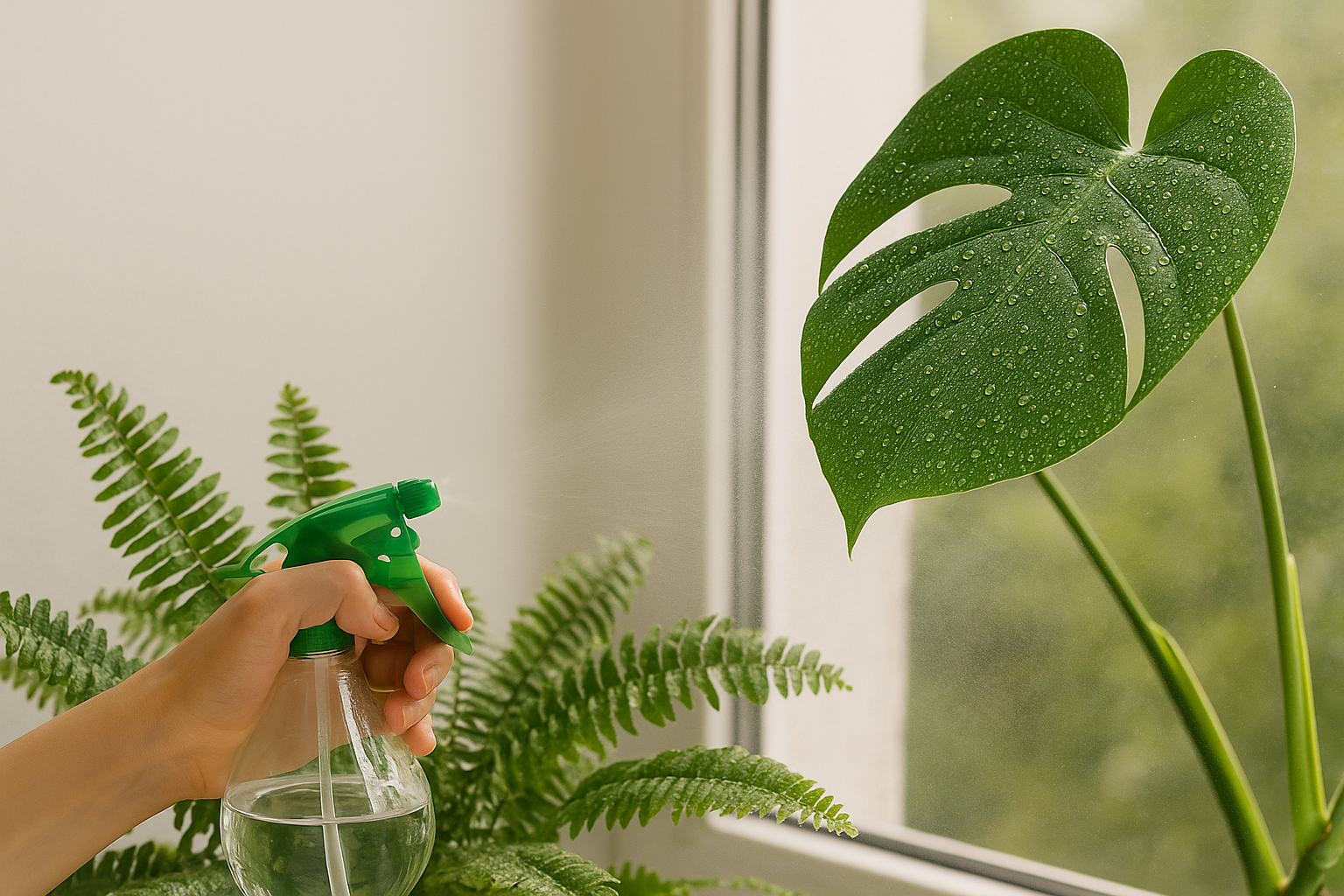 Kapradiny (např. nefrolepis, adiantum) – mají rády vysokou vlhkost, pravidelné rosení jim dělá dobře.