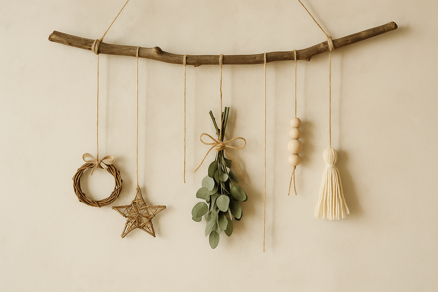 - Boho styl – větev s macramé závěsem nebo peřím.